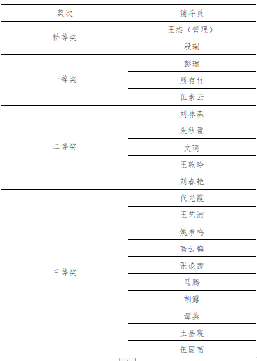经过激烈角逐,参赛选手王杰(管理)、段瑞获得特等奖,熊有竹、伍素云、彭瑞获得一等奖,刘林森、朱秋盈、文琦、王乾玲、刘春艳获得二等奖,代光霞、王艺洁、姚奉鸣、高云梅、张祾茜、马腾、胡露、谭燕、王嘉宸、伍国苇获得三等奖。