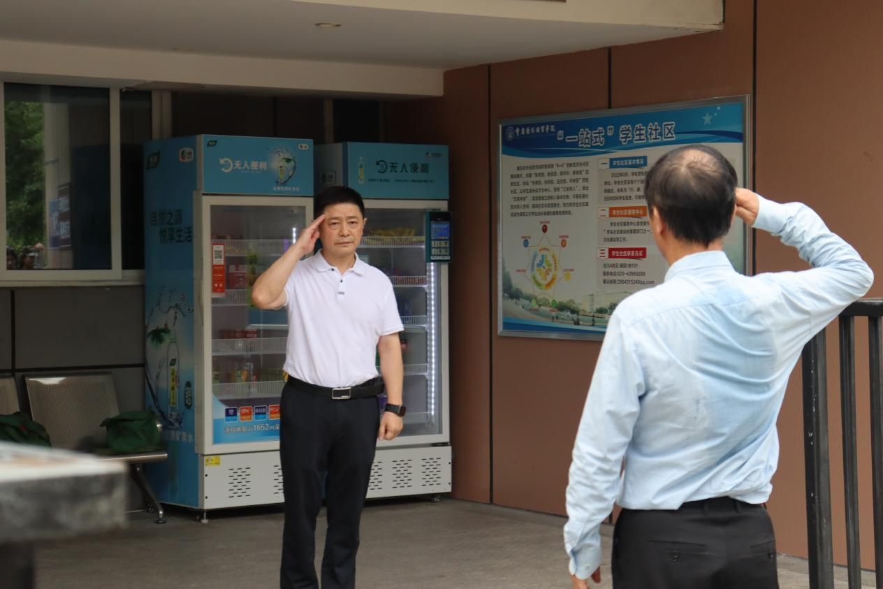 A校区消防疏散演练指挥员颜永明同志向演练总指挥叶绍荣同志报告演练准备就绪