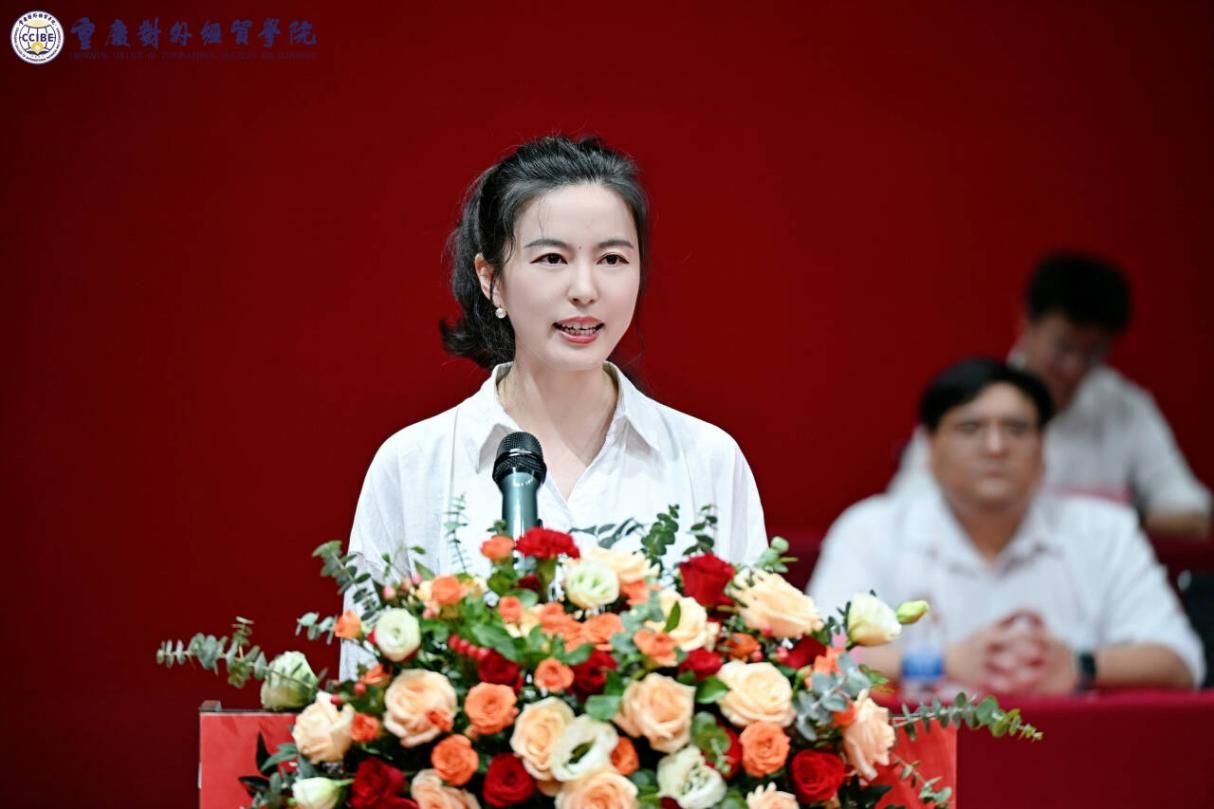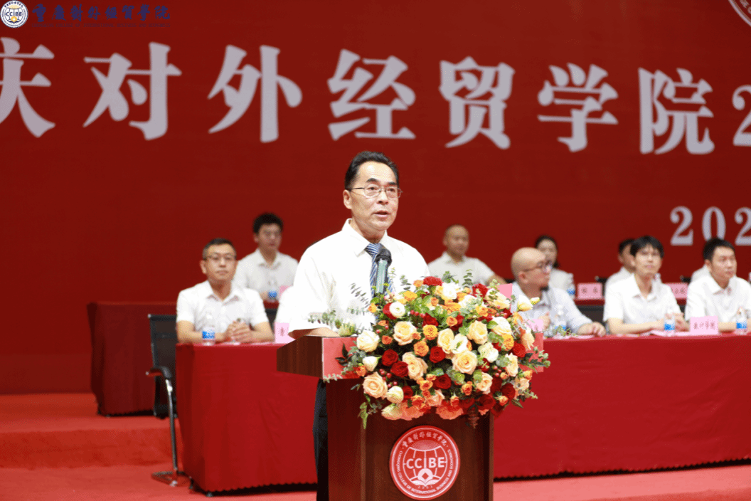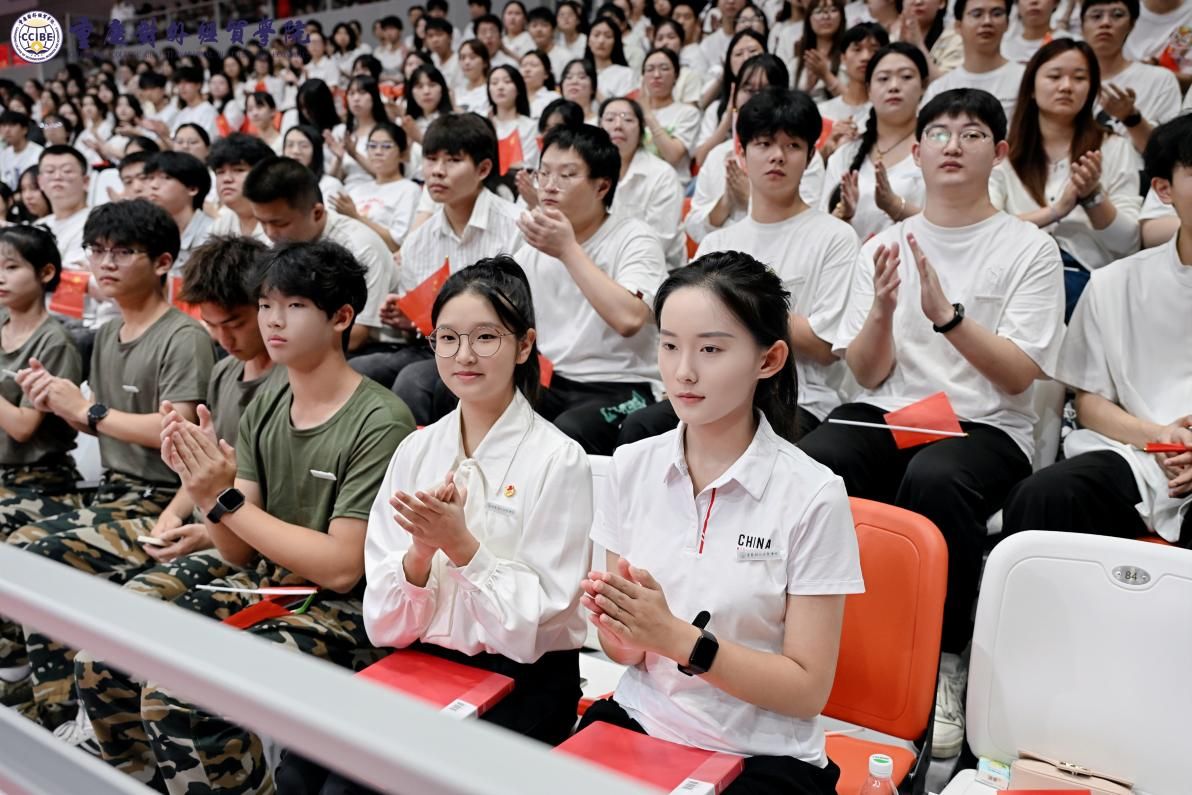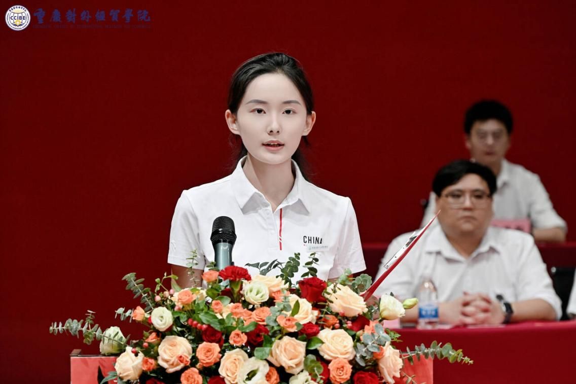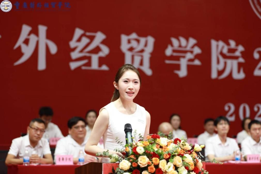 音乐舞蹈学院2023级学生莫洋博代表高年级学生发言,希望同学们在实践中提升综合能力,传承贸院优良学风。
