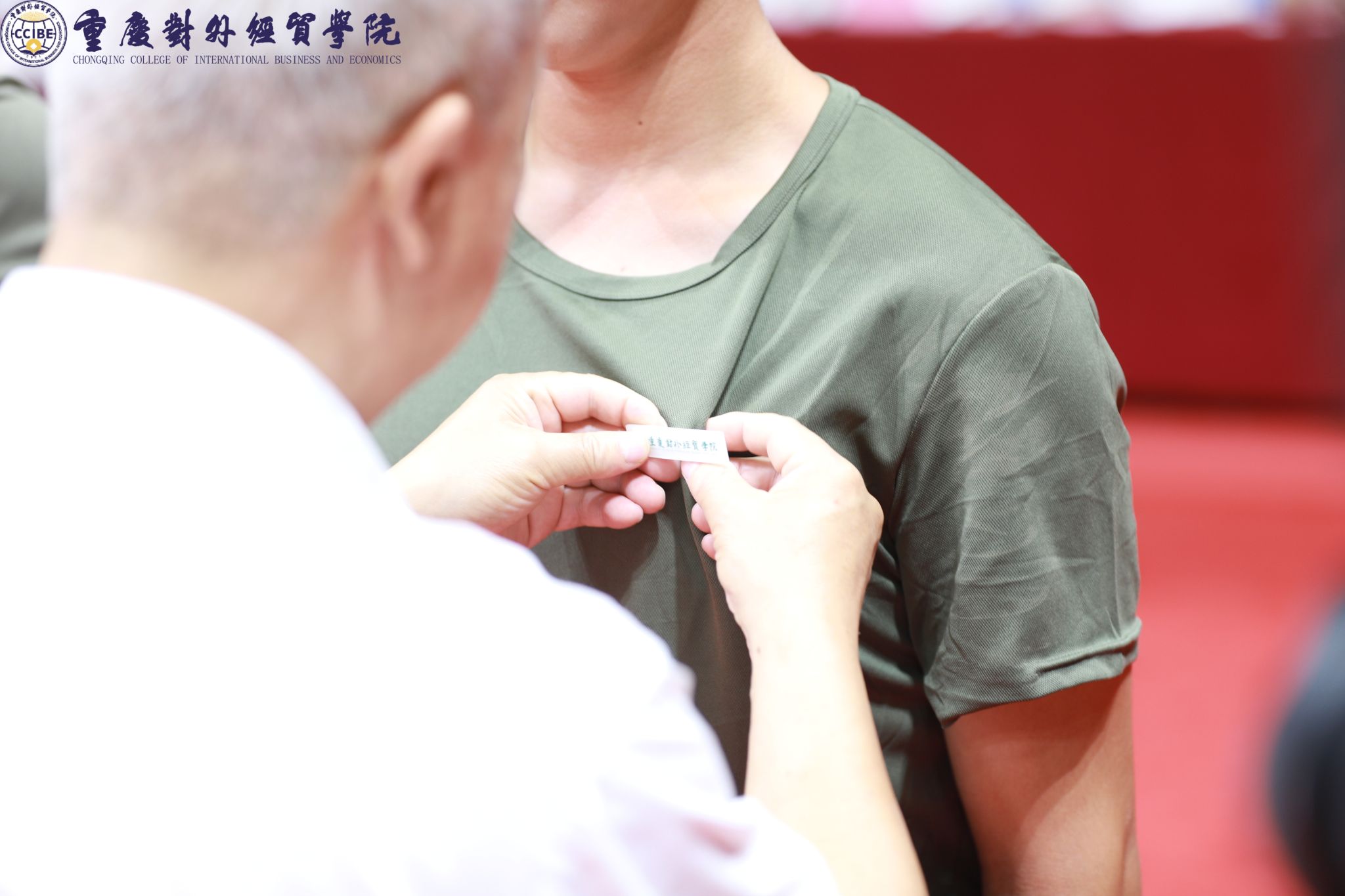 校长孙泽平为学生代表佩戴校徽