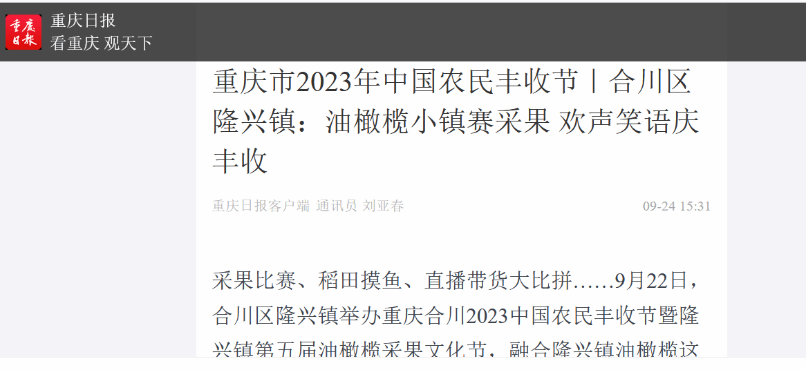 【重庆日报】报道重庆市2023年中国农民丰收节|合川区隆兴镇:油橄榄小镇赛采果 欢声笑语庆丰收