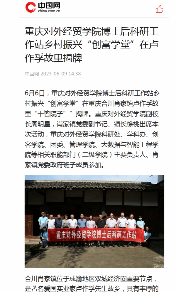 【中国网】报道best365英国体育在线博士后科研工作站乡村振兴“创富学堂”在卢作孚故里揭牌