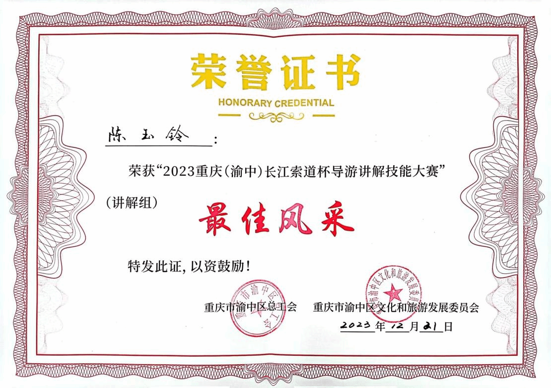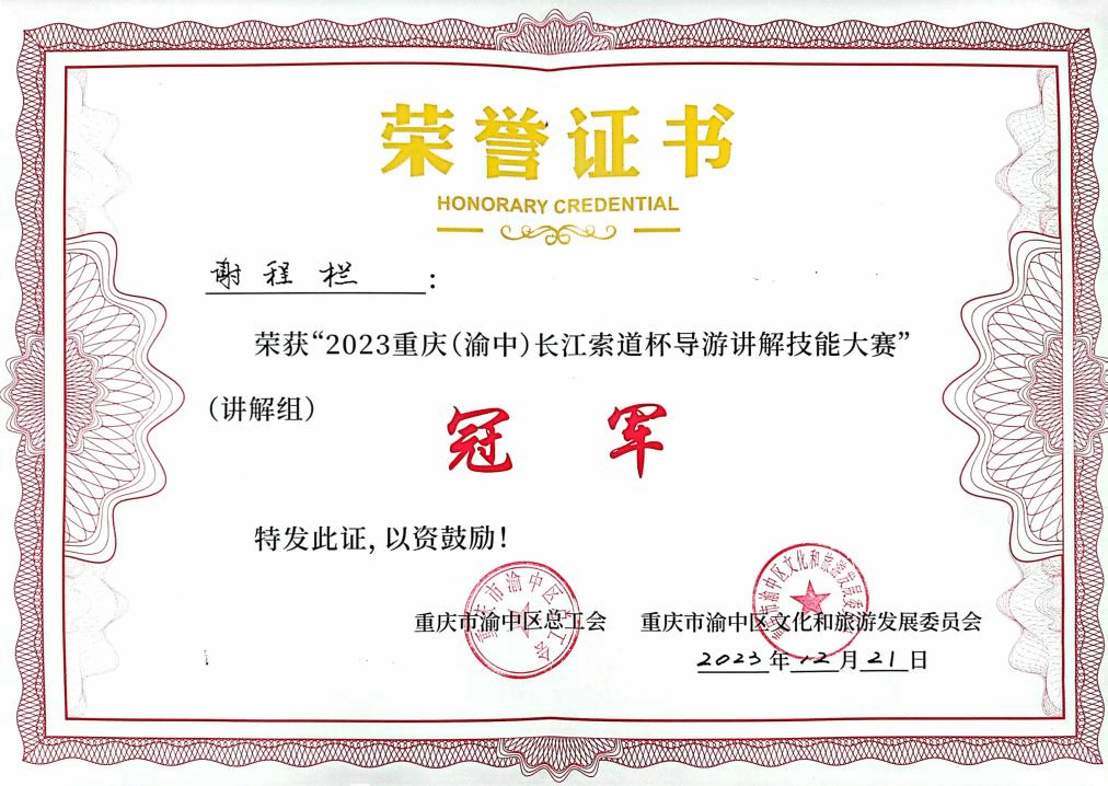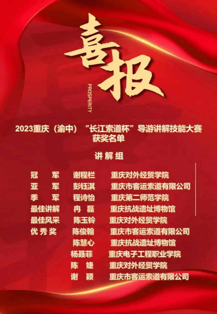 经过一周紧张严密的准备,在79名专业讲解员和各校优秀学生的复赛角逐中,谢程栏、陈玉铃和陈婕三名学生以声色并茂的讲解获得评委老师青睐,冲进赛事前十,获得参加决赛的资格。12月21日,在重庆长城酒店举行的2023重庆(渝中)“长江索道杯”导游讲解技能大赛决赛中,经过激烈刺激的比拼,学校谢程栏同学荣获大赛第一名,陈玉铃同学荣获“最佳风采奖”,陈婕同学荣获大赛“优秀奖”,best365英国体育在线荣获“最佳组织奖”。
