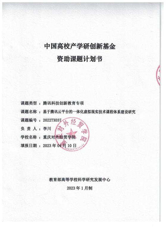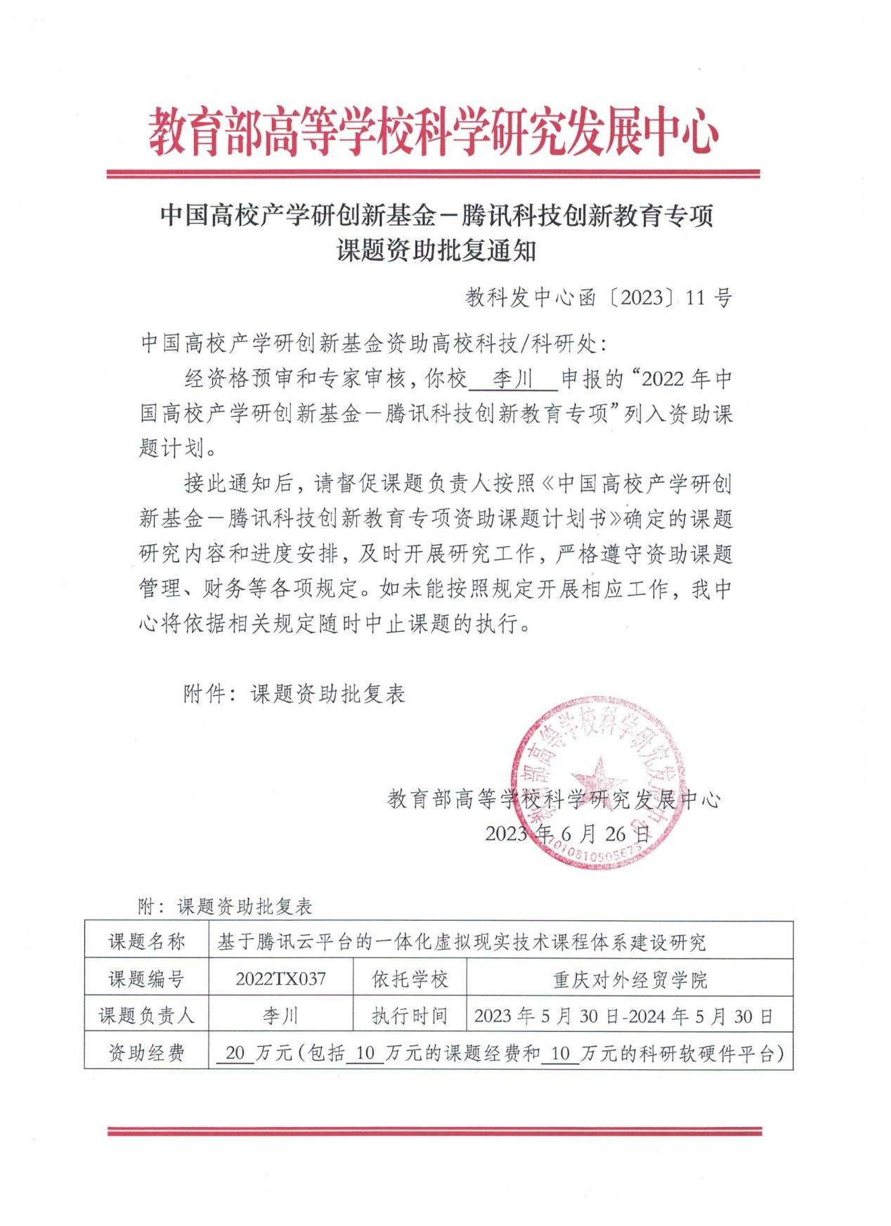 近日,教育部高等学校科学研究发展中心公布了《中国高校产学研创新基金-腾讯科技创新教育专项课题资助批复通知》(教科发中心函〔2023〕11号),我校大数据与智能工程学院李川老师团队《基于腾讯云平台的一体化虚拟现实技术课程体系建设研究》获批中国高校产学研创新基金-腾讯科技创新教育专项课题立项,项目资助经费20万元,是学校获得的最高经费资助的教育部项目,该项目获批是学校扎实开展以大数据智能化为特色的新工科建设的重要成果。