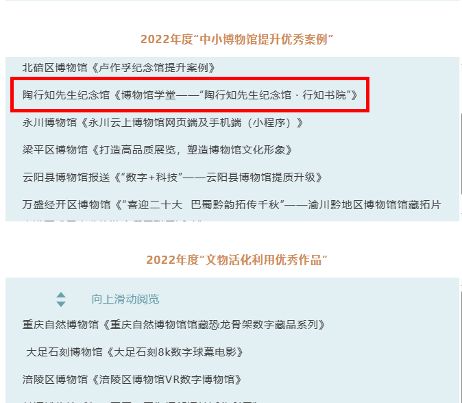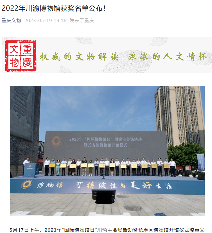 5月17日,在“国际博物馆日”川渝主会场活动启动仪式上,重庆市文物局、四川省文物局联合公布了2022年度川渝博物馆获奖单位,学校陶行知先生纪念馆·行知书院获“川渝中小博物馆提升优秀案例”文博殊荣。