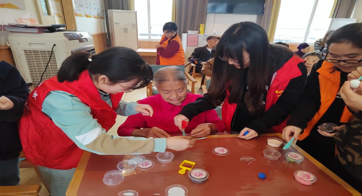 图为志愿者们与老人进行黏土手工制作