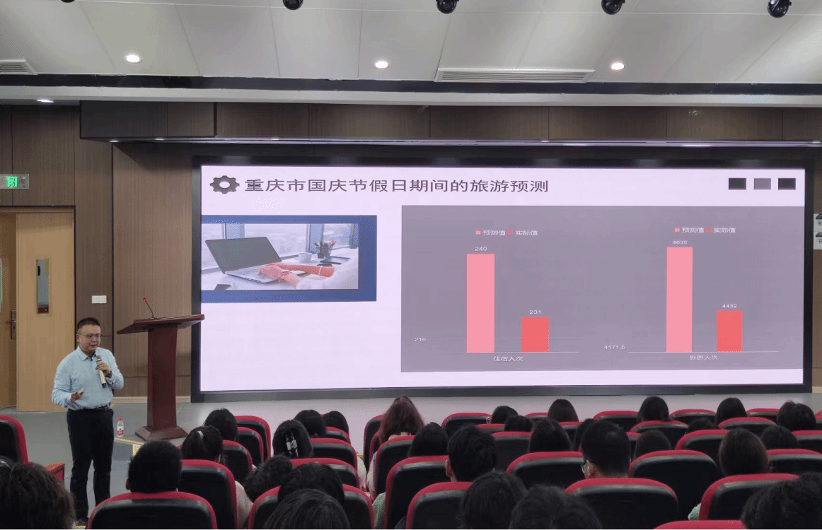研讨“高技能商务数字人才培养的创新实践”以主题讲座的方式在B8105报告厅顺利开展。会上,合川诚信集团闫顺董事长作“凝聚创新创业力量 推动乡村振兴发展”主题报告。同时分享了其子公司为生态农产品生产、销售,促进乡村振兴的宝贵经验。魏鹏教授作“数旅融合发展 智慧旅游提速”主题报告。魏鹏教授提出建立以旅游者为中心的数据库,对旅游人次精准预测、对旅游行为精准导引,同时提出文旅知识图谱构建、旅游者行为标签化、智能知识交互系统等智慧旅游解决方案,由此加强智慧旅游与社会经济发展的紧密联系。