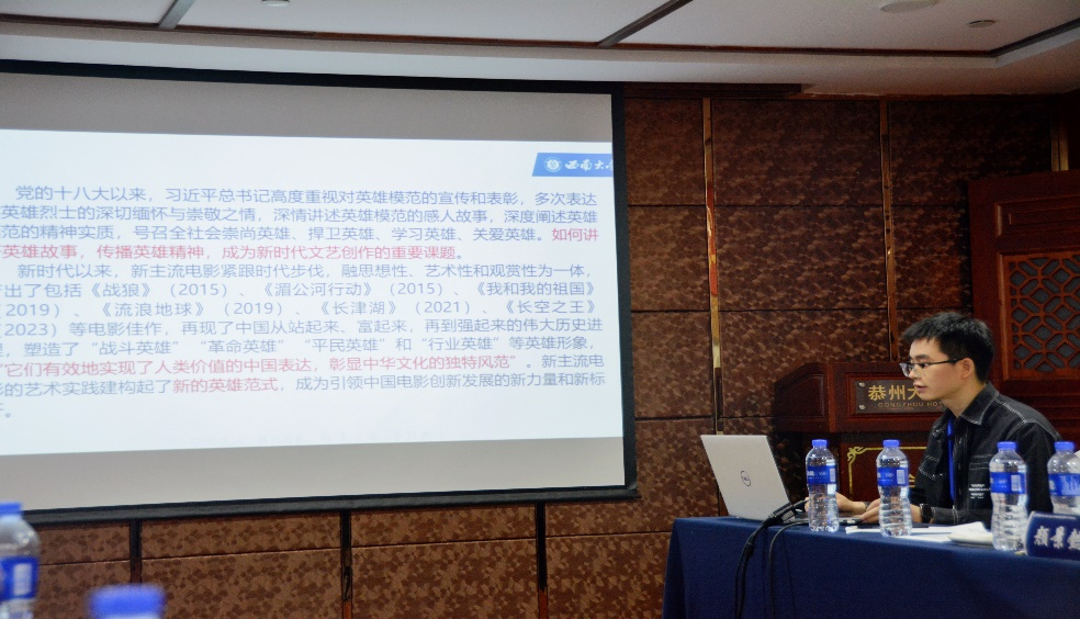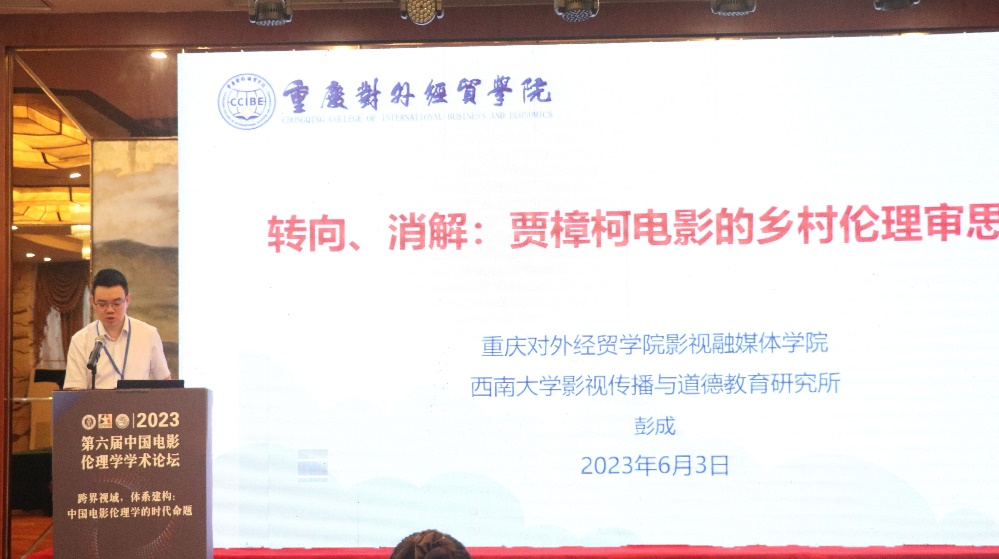 我校教师在论坛过程中与参会嘉宾深入交流,分享了影视传媒学术研究、影视跨文化传播等发展建设经验,得到与会人员的高度肯定。彭成副教授主持了“中国电影伦理学的批评范式与学理进路”分论坛,并以《转向、消解:贾樟柯电影的乡村伦理审思》为题介绍了乡村振兴背景下乡村和故人影像纪录、离乡和往事空间交替,以及发生对话关系,实现转向与演进、反思与消解。田鹏发言《新主流电影中人民英雄叙事的伦理表达》,探讨新主流电影在塑造人民英雄时,摆脱刻板模式,嵌入了大众伦理和普世人性,融注了真实情感,使得英雄更趋真实、更接地气。