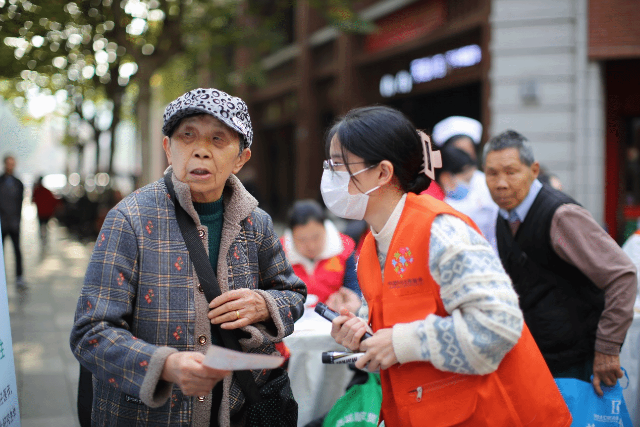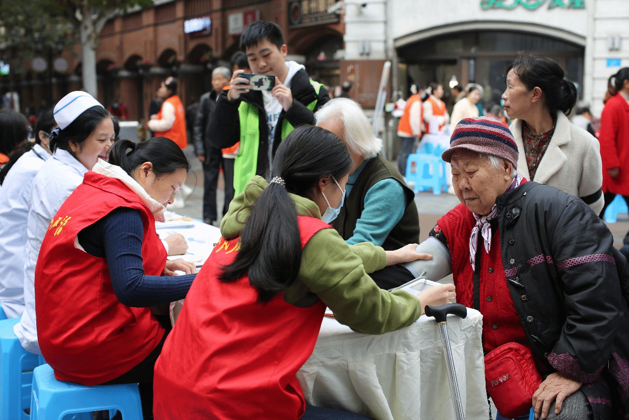重庆市第九人民医院记忆门诊、全科门诊的医生团队为老人提供测血压、测血糖、贴耳穴等服务,并为他们进行现场诊疗、详细讲解健康相关知识,同时根据每位患者的身体状况进行健康指导,给出专业的用药及治疗指导意见。