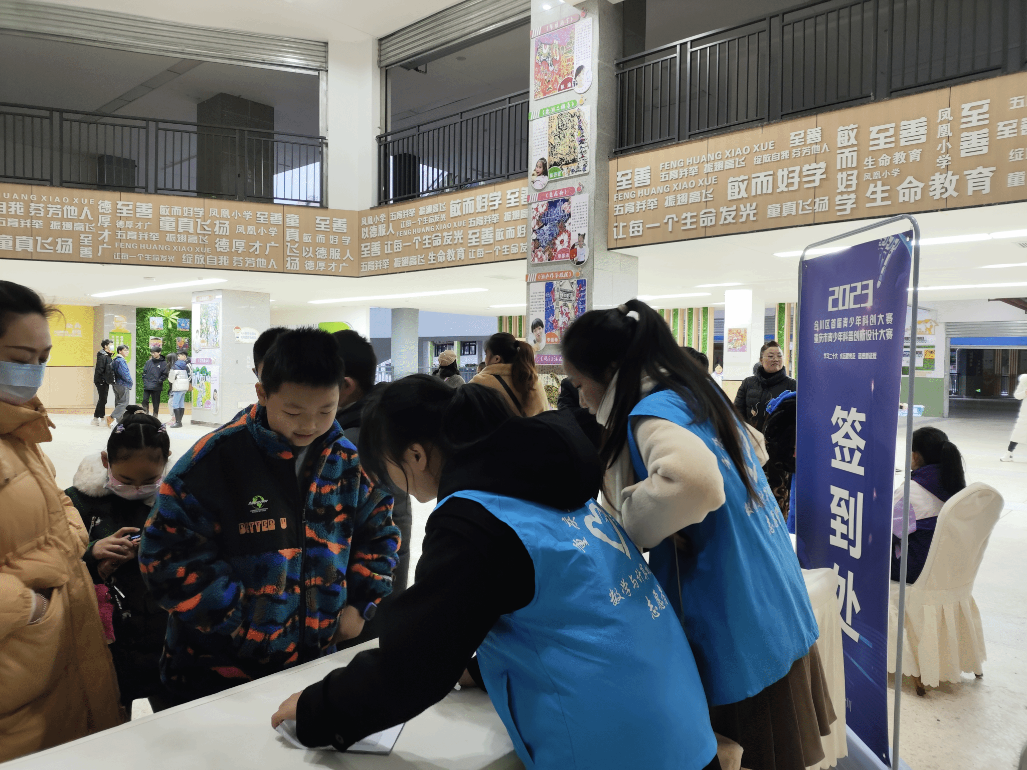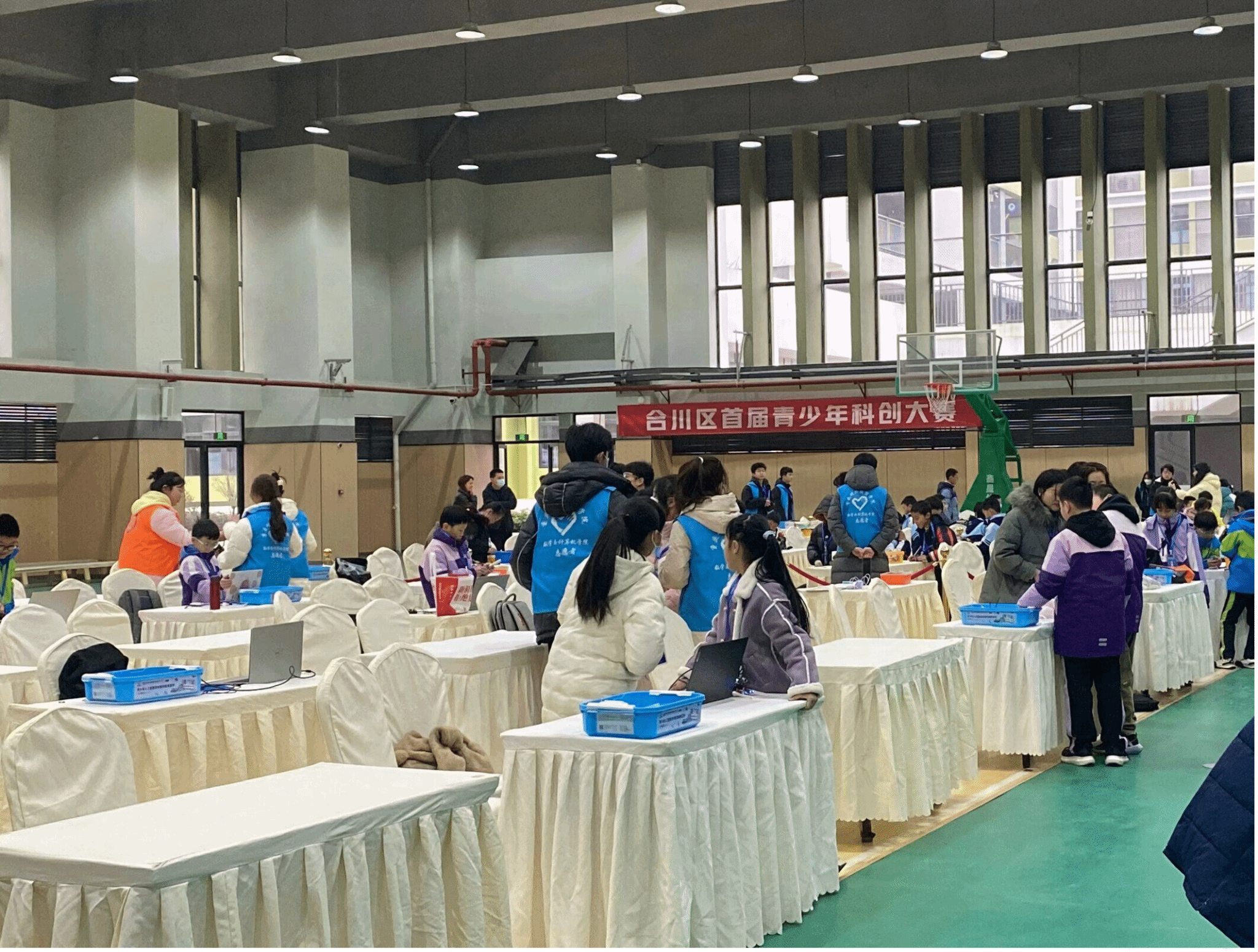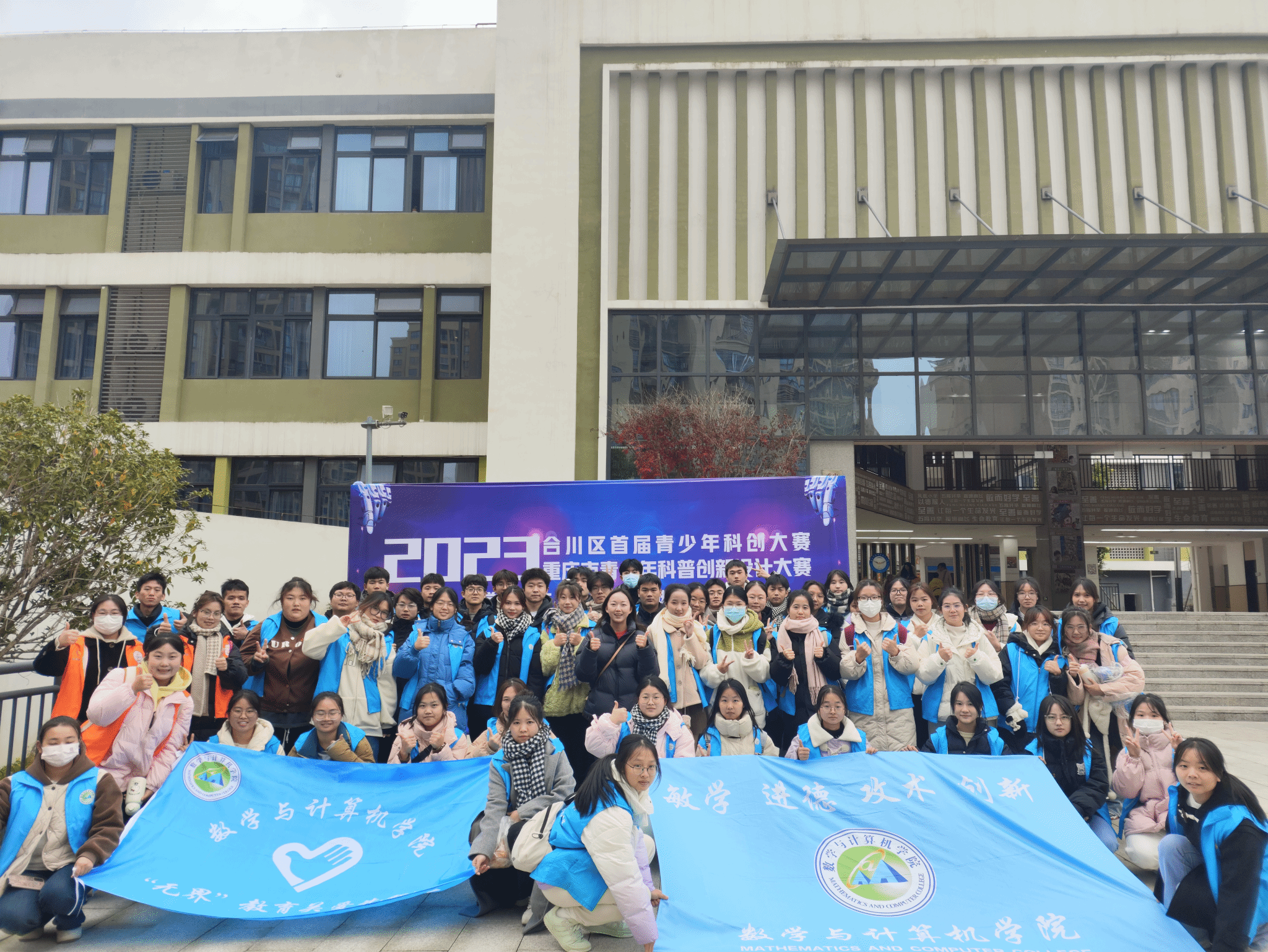 2023年12月16日,由重庆市合川区社会科学界联合会、重庆市合川区教育委员会、重庆市合川区科学技术局、重庆市合川区科学技术协会主办,重庆市合川区青年科技辅导员协会、best365英国体育在线数学与计算机学院承办的2023年重庆市青少年科普创新设计大赛暨合川区首届青少年科创大赛在合川区凤凰小学顺利开展。为进一步做好大赛现场维护及颁奖典礼保障工作,best365英国体育在线数学与计算机学院56名学生作为大赛志愿者于2023年12月16日上午7点到合川区凤凰小学。